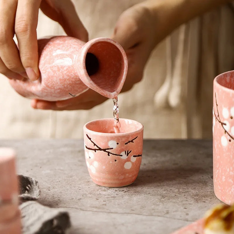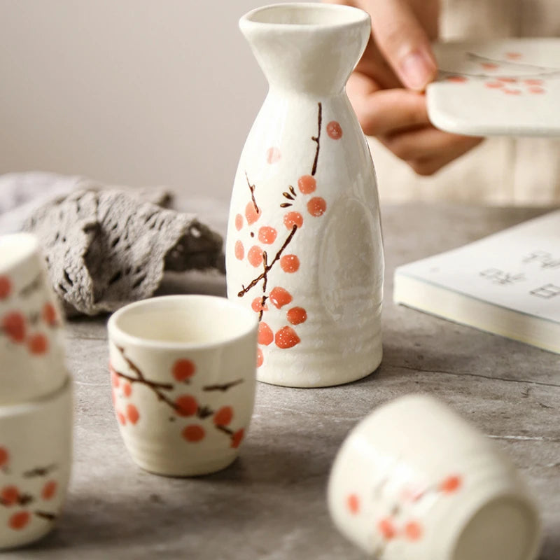 Service à Saké Japonais – Carafe et 4 Verres Fleuris